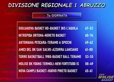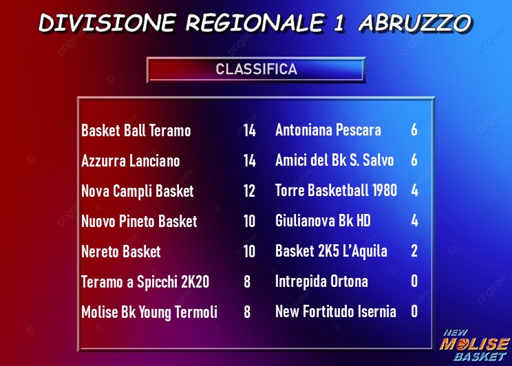 Continua la corsa a due a punteggio pieno al comando della classifica, anche se una delle due fa più fatica del previsto a vincere la sua partita. Si tratta del Basket Ball Teramo, che fa suo di sole due lunghezze il match di Torre de' Passeri ma ottiene comunque una vittoria importante su un campo difficile come quello torrese. Più agevole il successo di Lanciano a San Salvo con quasi venti punti di margine. Dietro alle due battistrada tiene la Nova Campli, che supera Pineto nel big match del giorno e favorisce l'aggancio alla stessa Pineto di un Nereto che va a vincere ad Ortona. La Molise Basket Young, con la sua vittoria nel derby, agguanta il Teramo a Spicchi, che perde sul campo dell'Antoniana Pescara. Seconda vittoria stagionale, infine, per Giulianova Happyu Drake contro il Basket 2k5 L'Aquila.