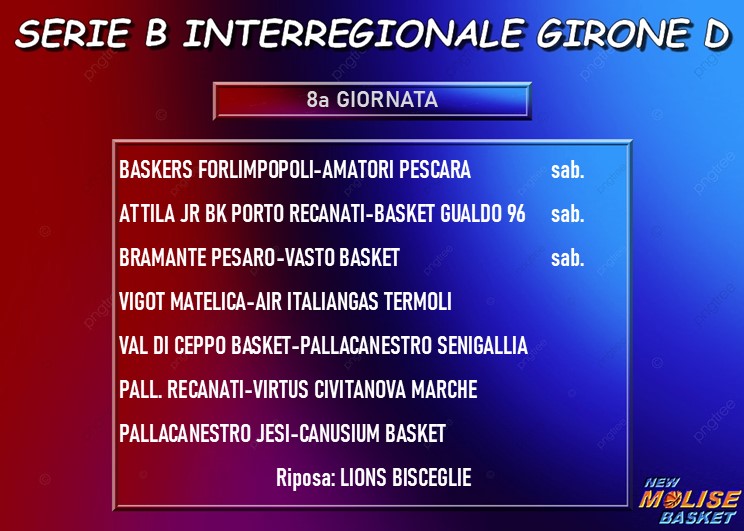 Dicevamo della testa della classifica e del big match giocato domenica scorsa fra Recanati e Matelica. Ebbene, in questa ottava giornata è in programma un altro big match, quello che mette di fronte proprio le due squadre che guidano il campionato Ancora in casa Recanati, che ospita Civitanova Marche in un’altra gara-spareggio dopo la quale la formazione vincente resterà sola al comando. Le tre squadre al quarto posto, Porto Recanati, Senigallia e Vasto, sono impegnate rispettivamente in casa con Gualdo, in trasferta con Val Di Ceppa e ancora in trasferta con Pesaro in tre gare non semplici, e sono interessanti anche Jesi-Canusium e Forlimpopoli-Pescara. Riposano i Lions Bisceglie.