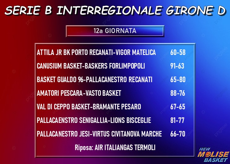 Italiangas Termoli ferma per il turno di riposo, facciamo il punto sul campionato dopo la disputa della dodicesima giornata. Le gare giocate decretano la sconfitta dell’ex capolista solitaria Matelica, che nell’unico match giocato sabato subisce un ko di misura a Porto Recanati, facendosi agguantare al comando da Recanati grazie all’ampia vittoria del quintetto di coach Schiavi sul campo di Gualdo. e da Civitanova Marche, che fa suo il posticipo di lunedì a Jesi. Con il successo sul Matelica, Porto Recanati si avvicina alla vetta, essendo ora distante soltanto due punti. Poco più dietro, importante vittoria per Senigallia, che ferma la corsa verso le posizioni alte della griglia playoff da parte del Bisceglie. Poi ci sono le gare che riguardano da vicino l’Italiangas Termoli, i cui risultati non sono per niente favorevoli al quintetto molisano. Successi, infatti, di Canosa su Forlimpopoli e Pescara su Vasto, con le vincenti che effettuano entrambe il sorpasso in classifica sui termolesi, che a causa dei tre punti di penalizzazione si ritrovano ora penultimi con una sola lunghezza di vantaggio su Val Di Ceppo, anch’essa vittoriosa a spese di Pesaro.