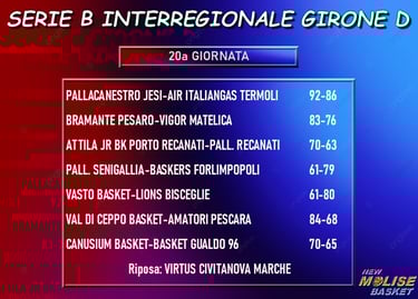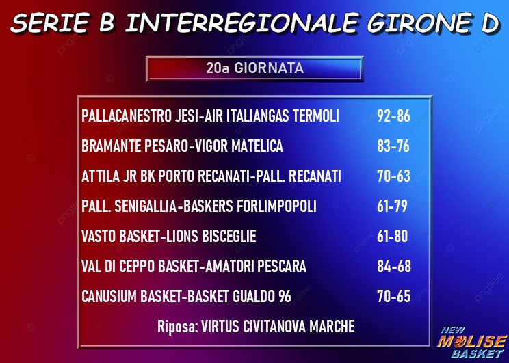 NOTE: Tiri da due: Jesi 17/32 (53%), Termoli 23/40 (57%). Tiri da tre: Jesi 12/26 (46%), Termoli 9/28 (32%). Tiri liberi: Jesi 22/31 (71%), Termoli 13/24 (54%). Rimbalzi: Jesi 37 (Ogiemwonyi 11), Termoli 35 (Diarra 8). Assist: Jesi 16 (Castellino e Scarpone 4), Termoli 21 (Pianegonda 7). Palle perse: Jesi 15, Termoli 11. Palle recuperate: Jesi 6, Termoli 10. Falli tecnici a Grimaldi (Termoli) e Bagdonavicius (Jesi). Fallo ancisportivo a Diarra (Termoli). Progressione punteggio: 26-13, 15-21, 26-19, 25-33.