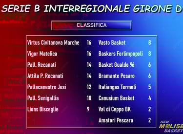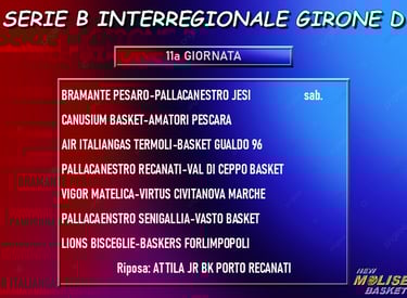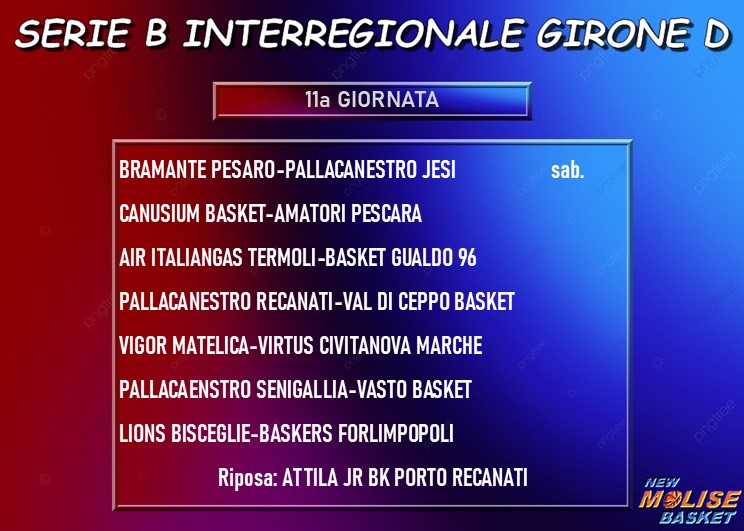 L’undicesima giornata propone agli appassionati la sfida fra le due prime in classifica, con Matelica che ospita Civitanova Marche in un match in cui - ovviamente - ci si gioca il primato solitario in graduatoria. Alla finestra ci sono le due recanatesi, con la Pallacanestro Recanati che gioca in casa contro Val di Ceppo con tutti i pronostici dalla propria parte e l’Attila Porto Recanati che… non gioca, visto che osserva il turno di riposo. Jesi, Senigallia e Bisceglie (occhio alla risalita dei pugliesi, che dopo un inizio di campionato “titubante” ora sembrano aver ingranato la quinta) hanno impegni sulla carta abbordabili, con la prima che va a giocare a Pesaro, la seconda che riceve Vasto e la terza che ospita Forlimpopoli. La sfida spareggio per la zona playout fra Canosa ed Amatori Pescara chiude il quadro delle partite in programma.