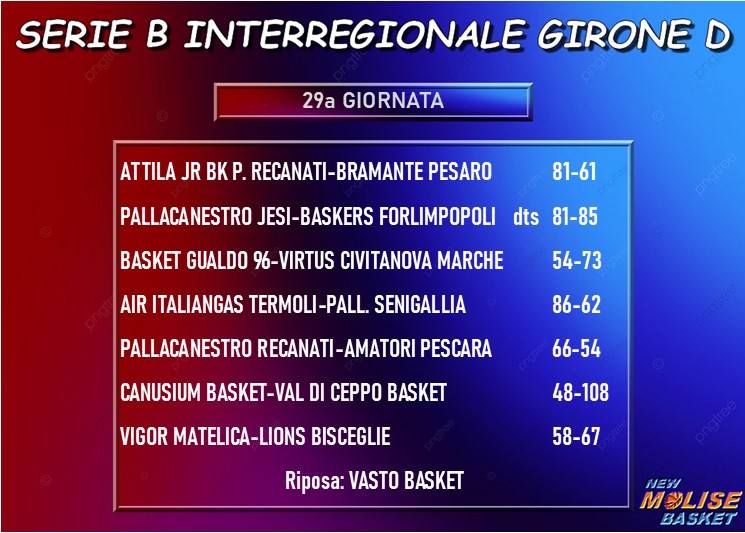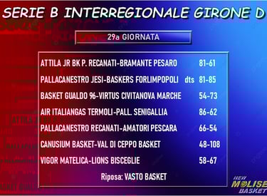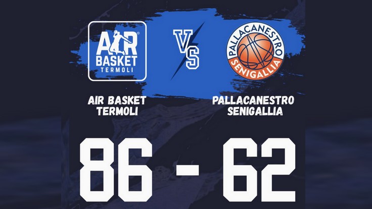 NOTE: Tiri da due: Termoli 23/39 (59%), Senigallia 20/54 (37%). Tiri da tre: Termoli 9/39 (23%), Senigallia 4/25 (16%). Tiri liberi: Termoli 13/20 (65%), Senigallia 10/16 (63%). Rimbalzi: Termoli 53 (Diarra 13), Senigallia 53 (Cicconi Massi 10). Assist: Termoli 19 (Rupil Del Risco 6), Senigallia 13 (Clementi e Cicconi Massi 3). Palle perse: Termoli 11, Senigallia 18. Palle recuperate: Termoli 12, Senigallia 10. Fallo antisportivo a Cassano (Termoli). Progressione punteggio: 21-16. 23-17, 21-14, 21-13.