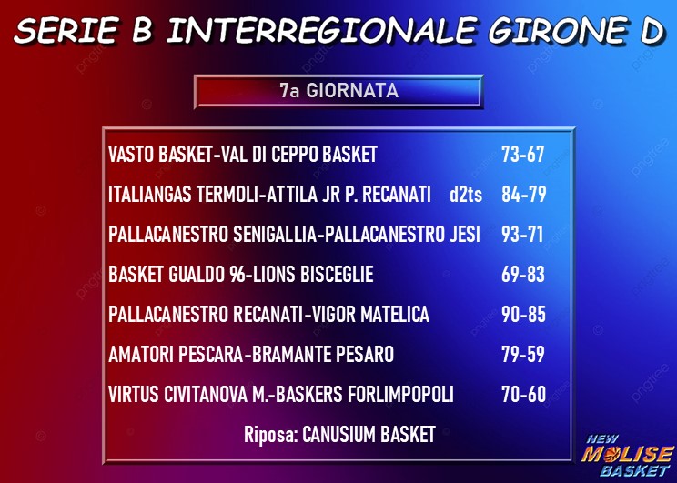 Recanati batte Matelica nel big match della settima giornata , con la vittoria come da pronostico di Civitanova Marche su Forlimpopoli,k ora la classifica è comandata da sole due formazioni, con Matelica che resta indietro rispetto a Recanati e Civitanova. Avanza Senigallia, che battendo Jesi agguanta Porto Recanati in quarta posizione così come Vasto, che supera in casa Val Di Ceppo. Immediatamente dopo la coppia Jesi-Termoli c’è Bisceglie, che continua la sua risalita vincendo a Gualdo con scarto in doppia cifra. Prima vittoria stagionale, infine, per l’Amatori Pescara contro Pesaro.