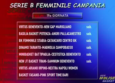 Tornando alla B femminile, fra le due prime della classifica il compito sulla carta più complicato spetta al Marigliano, che gioca sul campo della Virtus Benevento. In trasferta anche Catanzaro, che però affronta un’avversaria la cui classifica la dà come nettamente sfavorita contro le calabresi, ovvero lo Stabia. Una gara non facile e una sulla carta a gevole per le due formazioni che inseguono più da vicino le battistrada, con Angri che va a far visita alla Basilia Potenza e Fasano che cerca di uscire dal periodo negativo ospitando la Pink Sport Time Bari. Interessante anche il match fra Ariano Irpino e Napoli Women, decisamente più scontato quello fra Trani e Samnium Benevento. Molto importante per le zone basse della classifica, invece, la sfida fra Battipaglia e Cestistica Benevento.