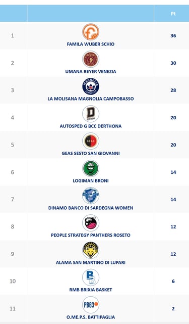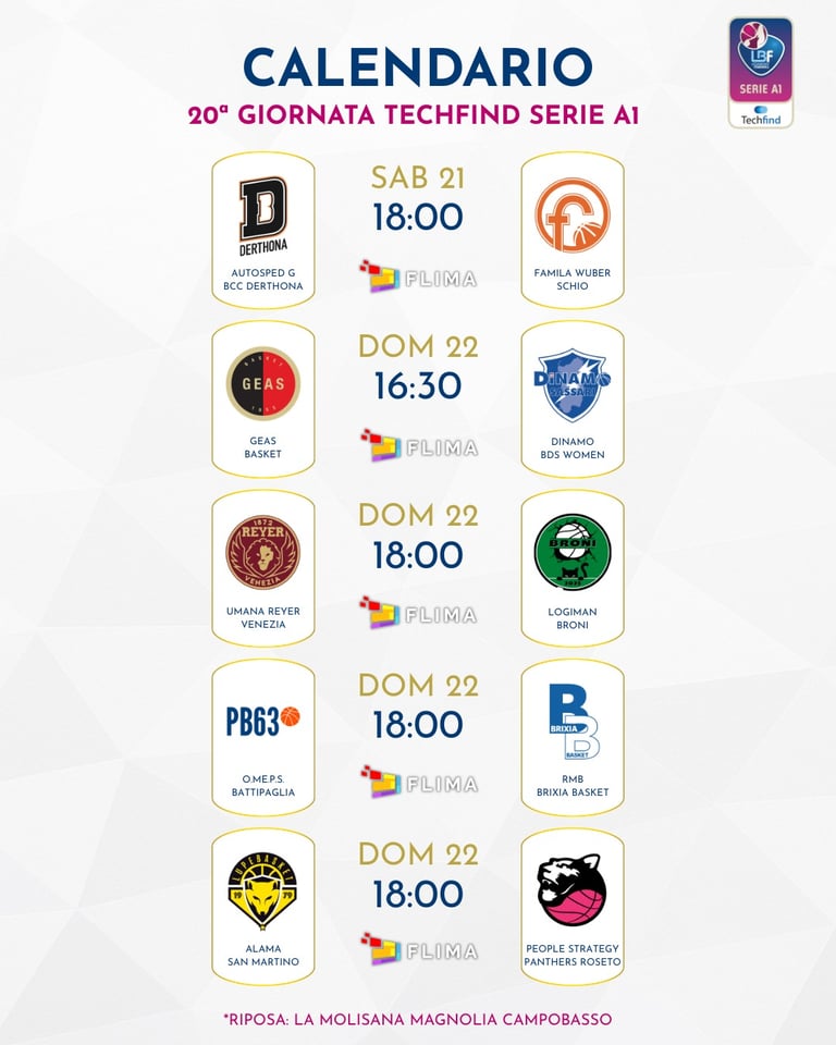 Detto della sfida fra Battipaglia e Brixia, nella quale il quintetto campano vuole dimostrare soprattutto a sé stesso di appartenere alla serie A1 e quello lombardo proverà a vincere per mettersi al riparo dalla possibilità - remota ma ancora esistente - di finire ultimo in regular season, a proposito della bagarre per l’ingresso nei playoff assolutamente da seguire sono le sfide fra Geas e Sassari, con Trozzola e compagne che hanno le loro possibilità giocando contro un quintetto che probabilmente ancora una volta non avrà Tinara Moore, e fra San Martino e Roseto, con le redivive Lupe che ricevono una formazione abruzzese che in settimana ha avuto il responso sul grave infortunio subito da Giulia Moroni nel match contro Derthona: rottura parziale del tendine di Achille della gamba sinistra, già operata con intervento perfettamente riuscito. Auguriamo anche noi alla brava giocatrice rosetana una pronta guarigione e un veloce - per quanto possibile - ritorno sul parquet.