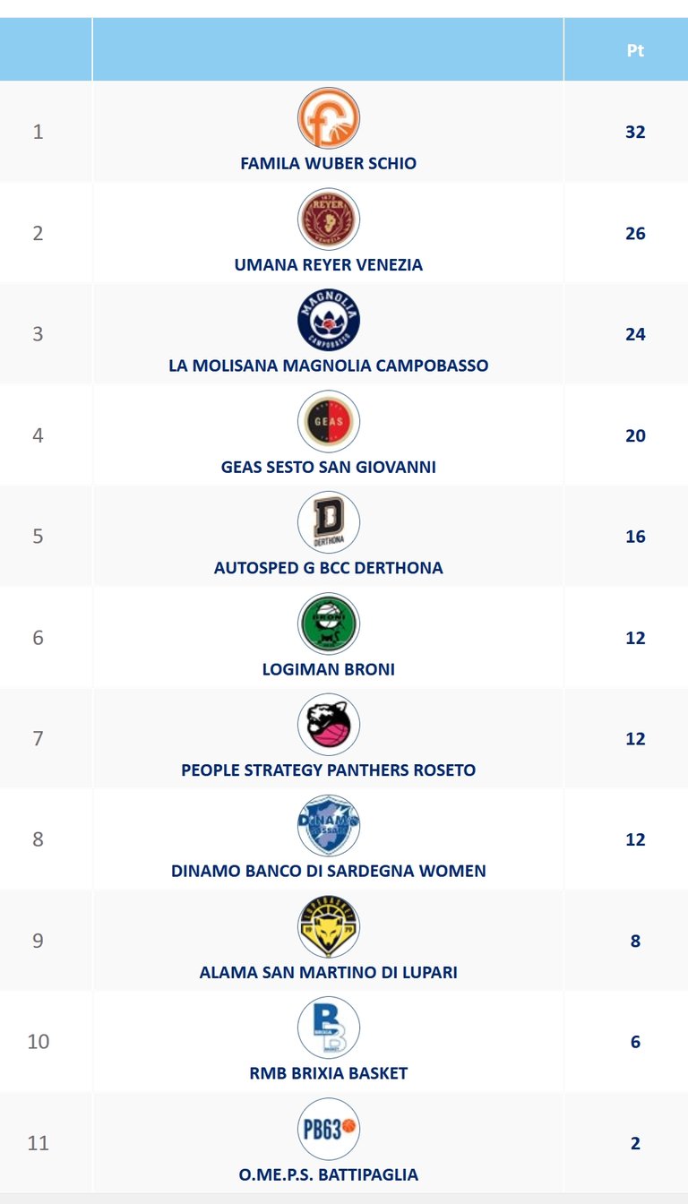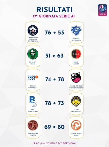 Schio vince in trasferta il big match di Venezia e, oltre ad ipotecare il primato in regular season, permette alla Magnolia di sperare ancora nel secondo posto, anche se sarà difficile che la Reyer possa perdere ancora in questa stagione regolare e realisticamente bisogna puntare a conservare una comunque probabilissima terza posizione dai tentativi di “attacco” del Geas. Un Geas che fa suo il derby lombardo a Broni e si avvantaggia ulteriormente in classifica su Gerthone, ferma per il turno di riposo. Al sesto posto, Broni è raggiunta da Roseto, come si diceva prossima avversaria della Magnolia, con il quintetto abruzzese che va a vincere un match importantissimo a Battipaglia e agguanta Sassari in settima posizione. Molto grave in ottica playoff la sconfitta di San Martino di Lupari a Brescia: ora le Lupe sono a -4 dall’ottavo posto e devono difendersi dall’assalto della stessa Brixia, che con questo due punti porta a 4 le lunghezze di vantaggio in graduatoria su Battipaglia.