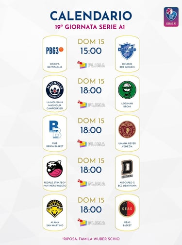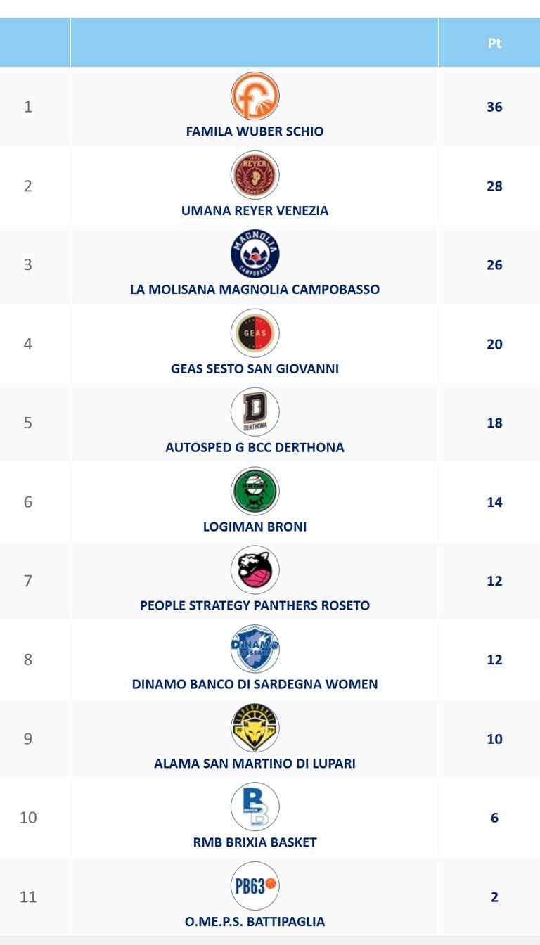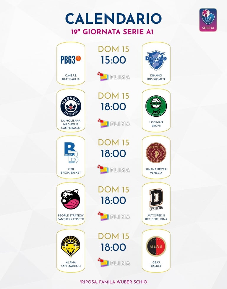 Delle altre quattro partite in programma, quella che a nostro parere sarà la più interessante è Roseto-Derthona, con le Panthers che ripetendo la bella prestazione contro la Magnolia possono mettere in grossa difficoltà Kunaiyi e compagne. E, a proposito, occhio al duello fra la pivot nigeriana e l’astro nascente Alyssa Ustby. San Martino di Lupari si gioca nelle prossime tre gare le possibilità di rientrare in corsa per un posto nei playoff cominciando con il match di questo fine settimana contro Sesto San Giovanni, che di contro deve portarla a casa se vuole avere ancora qualche minima speranza di soffiare la terza piazza alla Magnolia. Le Lupe “fanno la corsa” su Sassari e Roseto, con le sarde che si metterebbero abbastanza al sicuro da sorprese se vincessero il match di Battipaglia. Schio osserva il turno di riposo, Venezia - infine - affronta in trasferta Brixia con tutti i favori del pronostico.