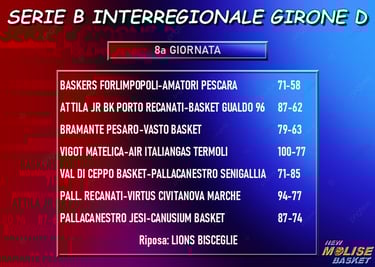 Per quanto riguarda le altre partite dell’ottava giornata. il big match fra le due squadre in testa alla classifica va con scarto inaspettatamente consistente a Recanati su Civitanova Marche. E così la squadra di coach Schiavi resta da sola al comando, con i civitanovesi che vengono agguantati da Matelica ed avvicinati da Porto Recanati e Senigallia, rispettivamente vincenti su Gualdo e Val Di Ceppo. Si ferma Vasto, battuta a Pesaro e viene raggiunta da Jesi, che supera il Canusium Basket davanti al pubblico amico. Forlimpopoli super Pescara ottenendo la terza vittoria stagionale e lasciando gli abruzzesi a far compagnia a Val Di Ceppo all’ultimo posto in classifica. Ha riposato Bisceglie.