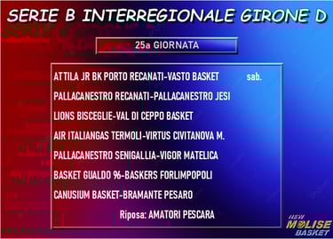 E’ senza dubbio Matelica-Senigallia l’incontro più interessante della giornata, che mette di fronte la terza e la quinta della classifica. Di notevole interesse anche Recanati-Jesi, mentre la capolista Porto Recanati riceve Vasto nell’unico match prefestivo e Bisceglie ospita Val di Ceppo in un testa-coda Virtuale (perché i pugliesi senza i cinque punti di penalizzazione sarebbero al comando insieme a Porto Recanati). Gualdo-Forlimpopoli è uno scontro fra due squadre con obiettivi diversi, Canosa Pesaro mette in palio punti importanti - per i pugliesi importantissimi - per la zona playout.