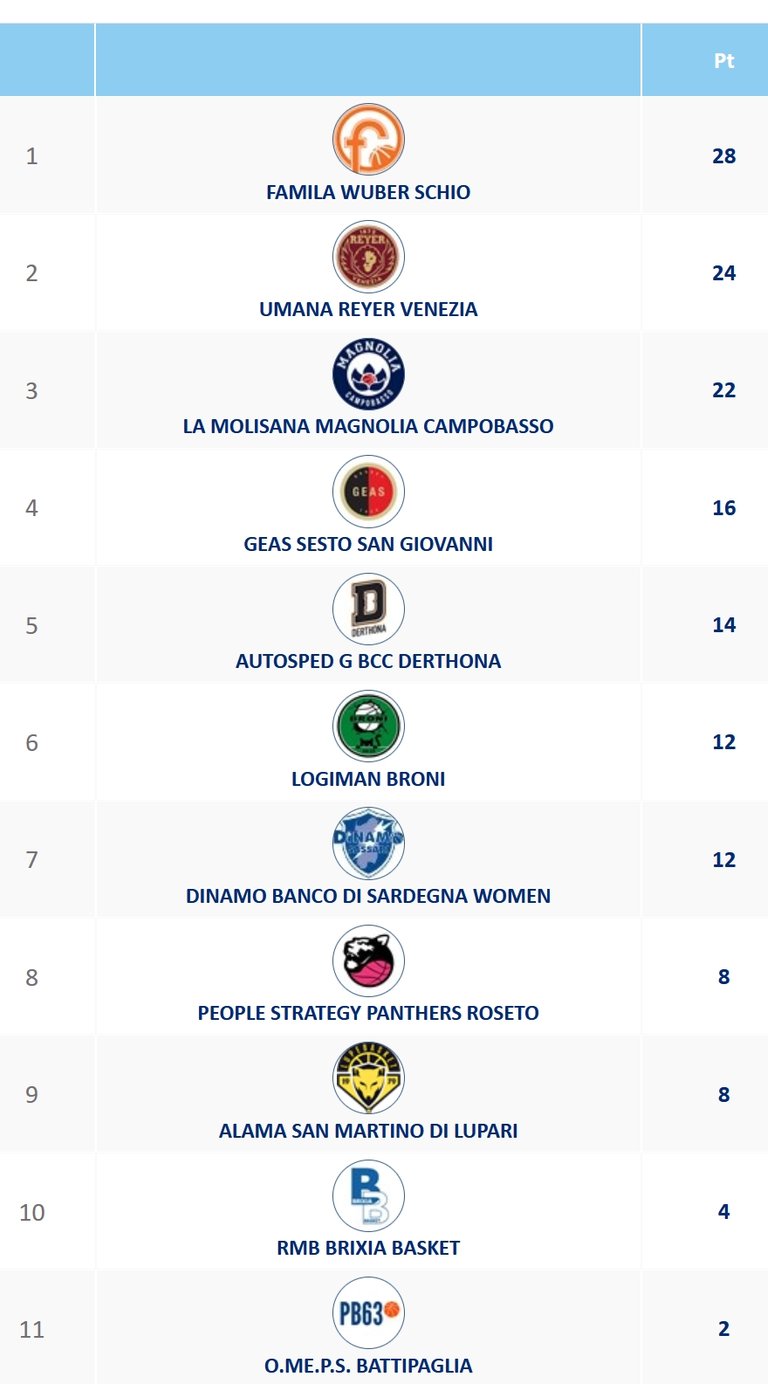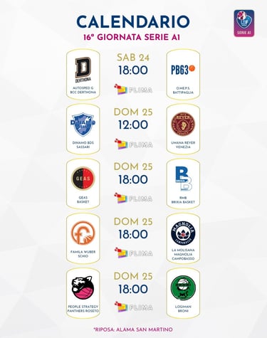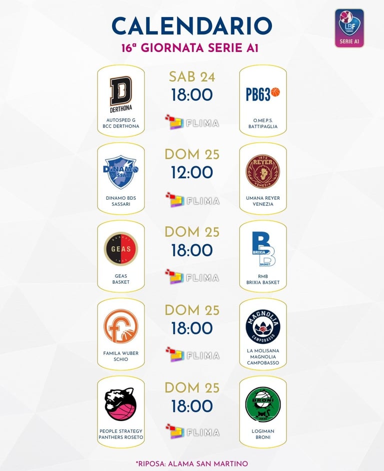 Fra le altre gare in programma, la meno scontata è senz’altro quella fra Panthers Roseto e Broni, con il quintetto abruzzese che cerca i due punti per approfittare del turno di riposo di San Martino di Lupari ed avvantaggiarsi nella corsa all’ottava posto della griglia dei playoff. Un successo in trasferta del quintetto lombardo, invece, metterebbe praticamente al sicuro la partecipazione ai playoff della squadra di Mirco Diamanti. Per il resto, la sedicesima giornata presente partite dal pronostico abbastanza scontato, con Venezia che gioca a Sassari, Sesto San Giovanni che ospita Brescia, e Derthona che nell’anticipo di questo pomeriggio affronta in casa Battipaglia.
