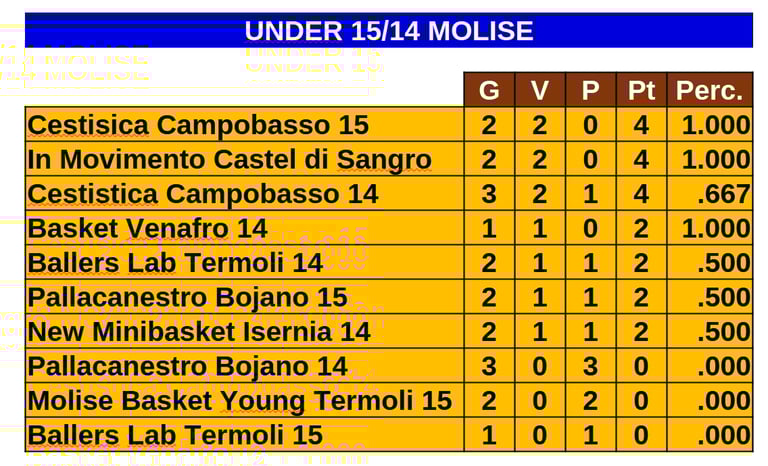 Eccoci qua per il secondo appuntamento con il recap della situazione dei campionati giovanili ai quali partecipano le squadre molisane. Questa volta, invece del breve commento ai singoli campionati - che lascia un po' il tempo che trova e col passare delle giornate fa capire sempre meno sull'andamento dei diversi tornei - credo sia molto più utile "linkare" i risultati e fornirvi qui le classifiche di ogni campionato. Raggruppo i vari campionati per regione (quelli abruzzesi, quelli campani e quelli molisani) e, all'interno di ogni gruppo, l'ordine è decrescente per età, . Tutte le graduatorie sono aggiornate a ieri, 26 novembre.