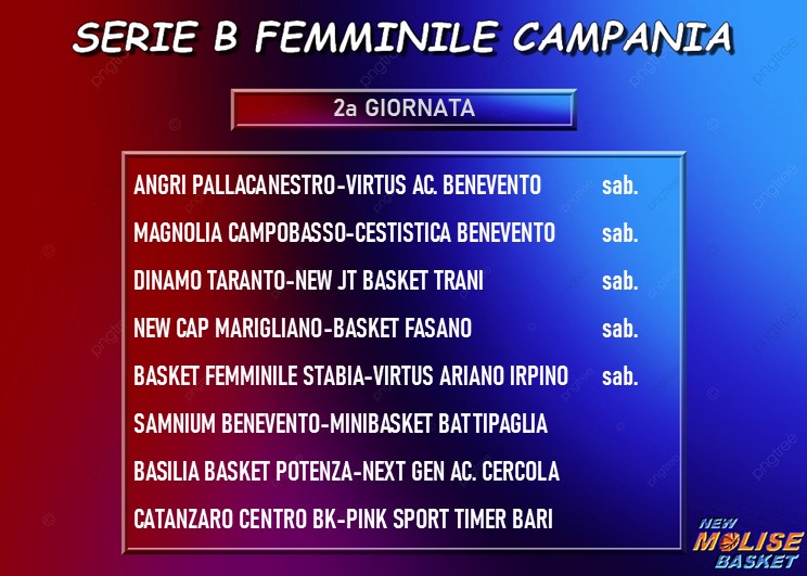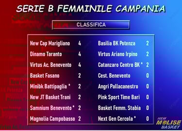 E' stato giocato nella serata di ieri il primo dei tre recuperi in programma nel campionato di serie B femminile Campania, recupero che ha visto l'Ariano Irpino conquistare i primi due punti della stagione andando a vincere in trasferta 73-47 contro lo Stabia. Restano da giocare le gare fra Next Gen Cercola (che sembra aver cambiato denominazione perché ora sul sito Fip è indicata come "Nextra Napoli Women Bkball"... ci adegueremo al prossimo post su questo campionato) e Catanzaro, rinviata alla prima giornata ed in programma il 14 ottobre, e fra Samnium, Benevento e Battipaglia, rinviata alla seconda giornata ed in programma il 30 ottobre. Qui di seguito la classifica aggiornata.