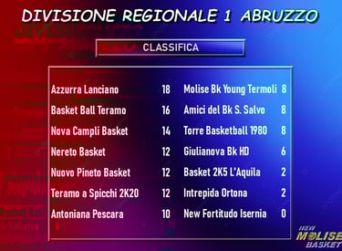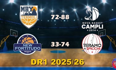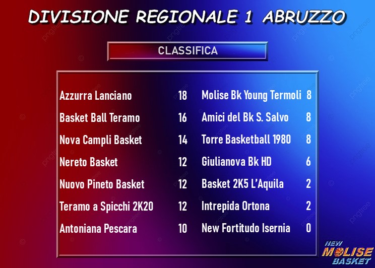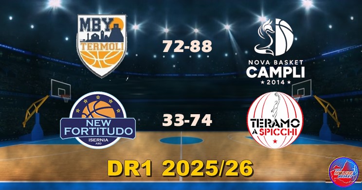 Entrambe sconfitte le molisane di Divisione Regionale 1. La Molise Basket Young Termoli viene superata in casa dalla Nova Campli, che in pratica chiude la gara fin da subito grazie ad una partenza a razzo che le consente di mettere a segno ben 32 punti nel primo quarto dandone 20 di differenza ai termolesi, che non riescono ad arginare il quintetto abruzzese. Il margine diventa di 24 punti all'intervallo lungo, ma nel terzo periodo c'è la reazione della squadra di coach Sabetta, che recupera la metà del divario consentendo all'attacco ospite di metterne dentro solo 8. Ma Campli si riorganizza e nell'ultimo quarto si scrolla di dosso le esitazioni portando a casa la vittoria. Per Isernia, nulla da fare contro Teramo a Spicchi nonostante un buon inizio di partita, che permette alla formazione di Antonio Bernardo di arrivare al decimo minuto pienamente in partita con soli cinque punti da recuperare. Poi, però, la difesa ospite sale di colpi e l'attacco molisano si inceppa, mettendo a segno solo altri 21 punti nel resto della gara, 7 per quarto. Il successo è per la formazione abruzzese.