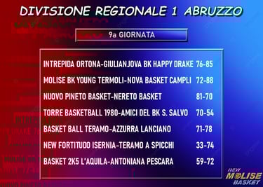 L'incontro clou della nona giornata va all'Azzurra Lanciano, che passa in trasferta sul Basket Ball Teramo e resta da sola al comando della classifica proprio davanti ai teramani. Terza Campli, quarta la coppia "in rima" Nereto-Pineto, con la seconda che vince lo scontro diretto con la prima e la aggancia in graduatoria insieme al Teramo a Spicchi. L'Antoniana Pescara vince ad Ortona e tiene il passo, il Torre Basketball batte ed aggancia San Salvo in classifica a quota 8 punti, insieme alla Molise Basket Young Termoli. Prima vittoria stagionale, infine, per l'Intrepida Ortona, che supera Giulianova ed agguanta L'Aquila in classifica, lasciando da sola la New Fortitudo Isernia all'ultimo posto.